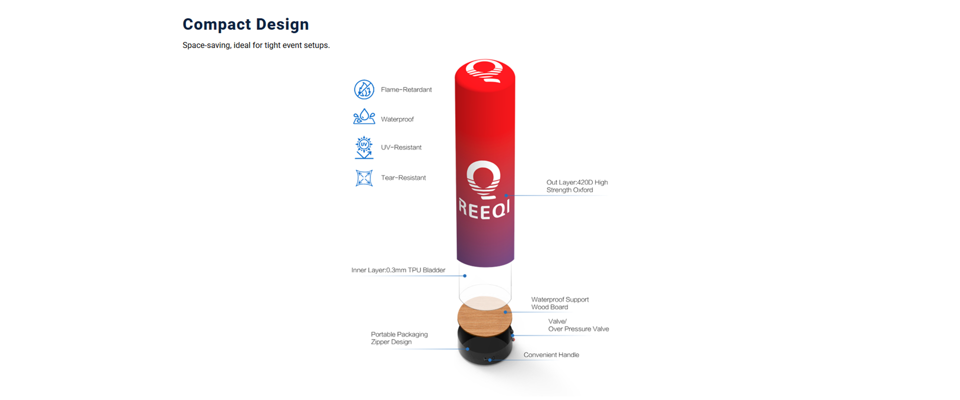 Airtight inflatable columns are sealed-air structures that reguire no continuous power after inflation offering a silent, clean look ideal for high-end or indoor events.They are easy to store and transport thanks to the blower-free design.Customizable in height and diameter (typically 45cm, 60cm, or 90cm), they support full branding with printed logos and optional LED lighting.The outer fabric and innerTPU bladder are replaceable, making them a durable and cost-effective long-term solution for impactful event signage and brand promotion. Get a Quote